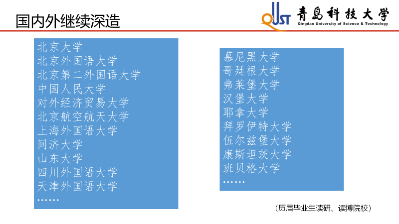我系德语专业四、八级通过率和优秀率在同类院校中名列前茅,学生在各类竞赛中常有崭获,每年都有多名毕业生考入国内外大学继续深造。迄今为止,我系已向教育、文化、媒体、经贸、政府机关等各行各业输出了大量优秀的德语人才。