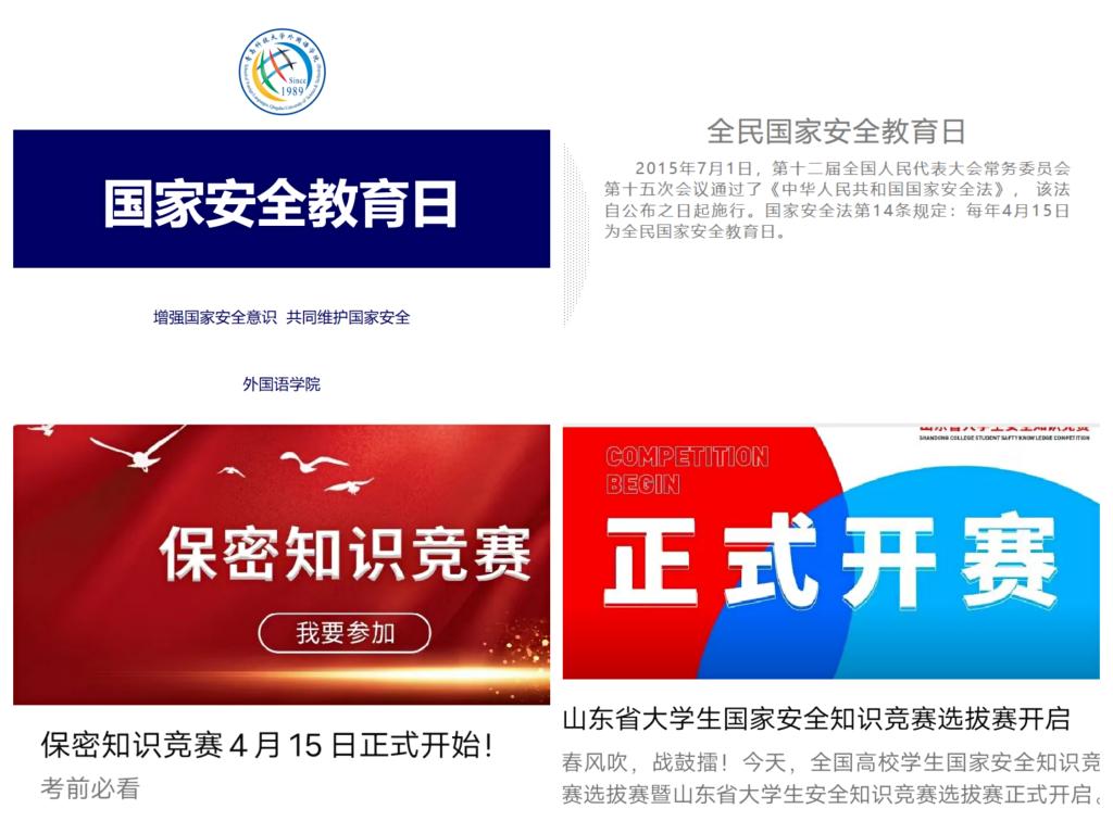 充分利用相关竞赛活动的契机,积极开展安全知识教育宣传,利用现代信息技术手段,创新安全教育形式,积极组织学生参加2021年全国高校学生国家安全知识竞赛选拔赛暨山东省大学生安全知识竞赛活动以及网络保密知识竞赛活动,切实增强学生国家安全意识。
