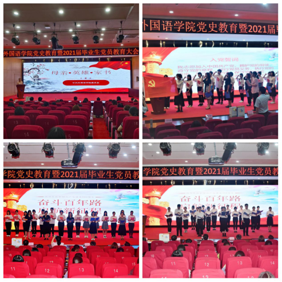 举办了“奋斗百年路 启航新征程”党史学习教育暨2021届毕业生党员教育大会。学院党委书记曲斌艳以“母亲·英雄·家书”为题,为全体毕业生党员上了离校前的“最后一堂党课”,勉励广大毕业生党员要牢记入党初心,坚定理想信念,立大志、明大德、成大才、担大任,努力成长为合格的的社会主义建设者和接班人。她寄语大家从党史学习教育中汲取智慧和力量、努力奋斗,以实际行动和优异的成绩为党旗增辉,为母校添彩,向党的百年华诞献礼!曲斌艳带领全体毕业生党员面向党旗重温入党誓词,铮铮誓言,让党员们再一次感受党的神圣光辉,更加坚定入党信念和为共产主义事业奋斗终身的决心。学院教工党员代表带领同学们用中、英、德、俄、日、朝鲜语六种语言集体朗读《共产党宣言》,全体毕业生党员集体献词《百年芳华逐梦而行》,铿锵有力的声音带我们回顾了百年来中国共产党带领人民走过的光辉历程和取得的辉煌成就。