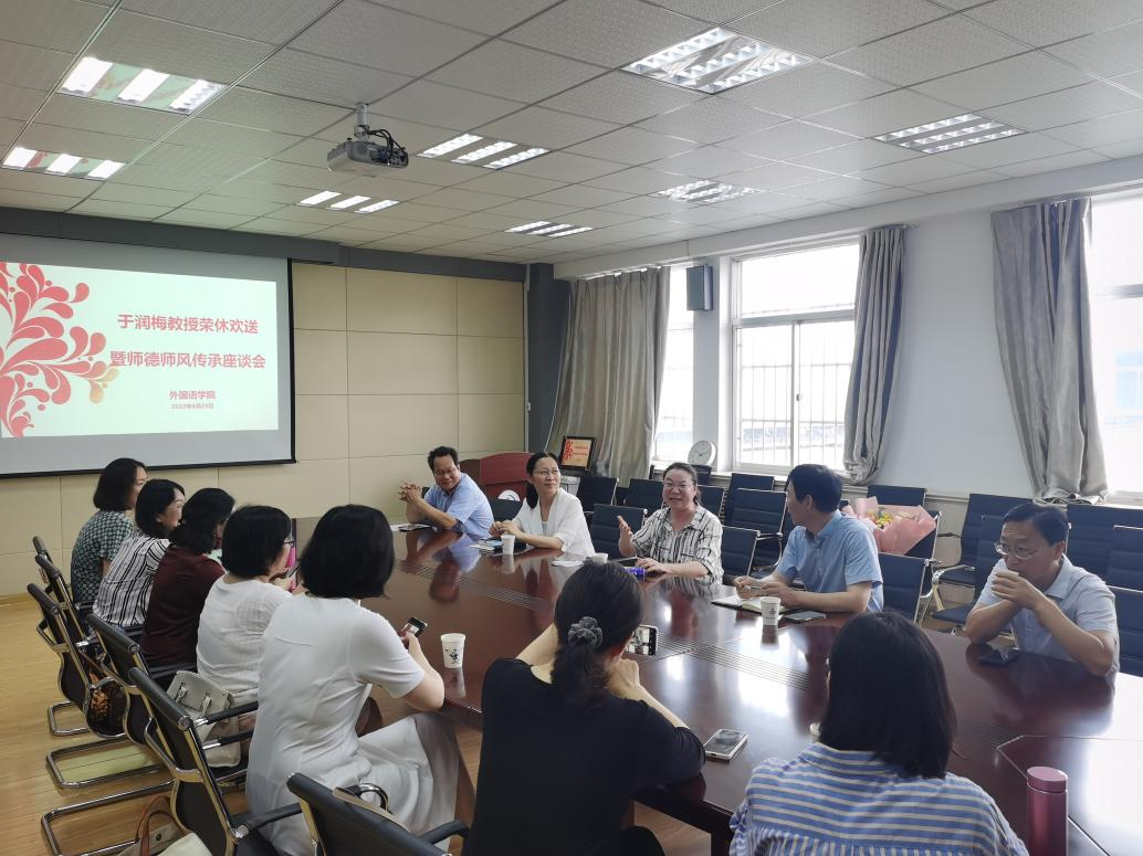 举办于润梅教授荣休欢送暨师德师风传承座谈会。退休教师于润梅教授、学院领导班子成员以及外语系教师参加,院长尹洪山主持。