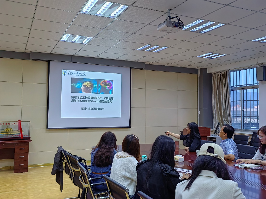 5月29日晚,北京外国语大学博士生导师范琳教授应学院邀请,在517会议室做了题为《情绪词加工神经机制研究:来自情绪归类任务和情绪Stroop任务的证据》的学术讲座。讲座由副院长康宁教授主持,学院部分教师及研究生聆听了讲座。