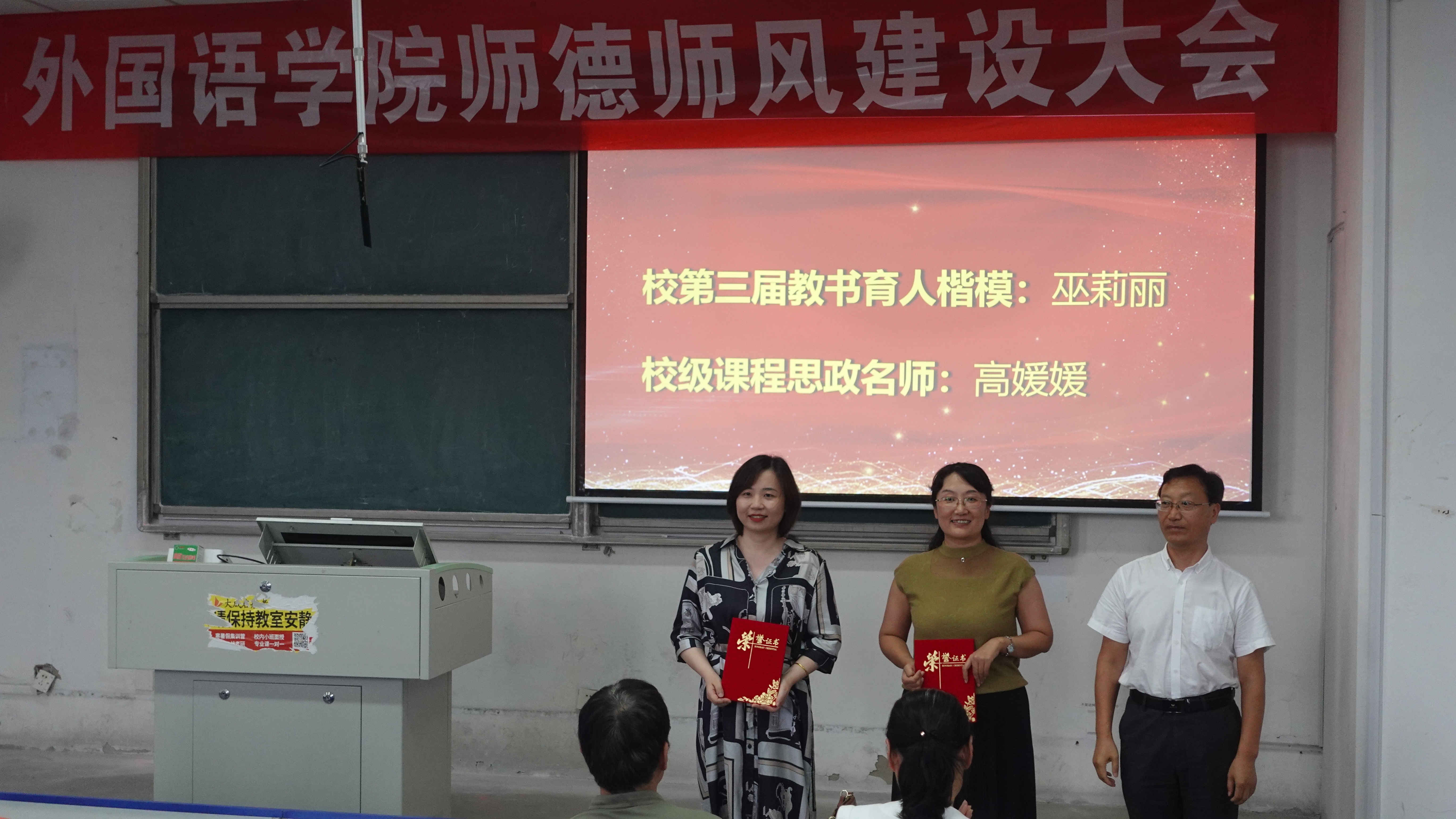 在弘毅楼E203教室召开师德师风建设大会。会议由党委委员巫莉丽主持,全体教职工参加大会。