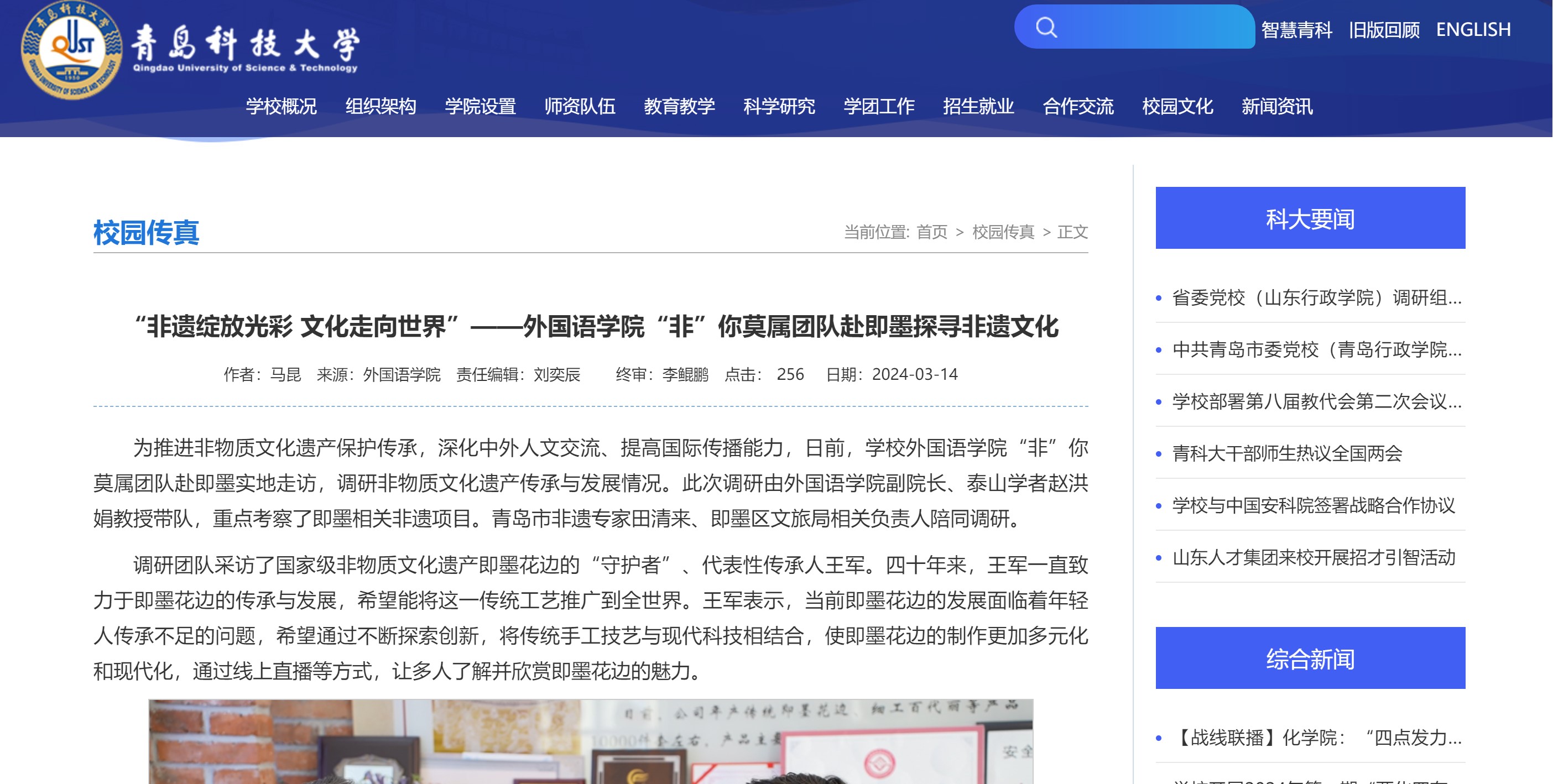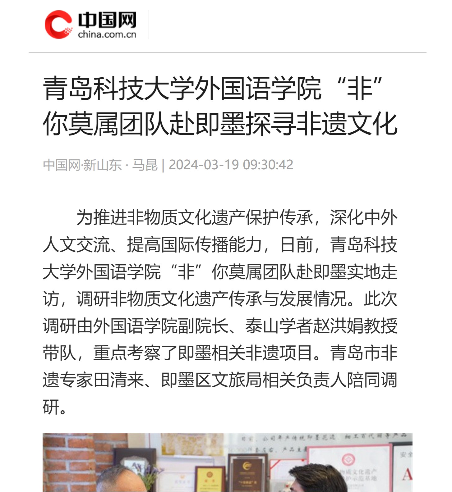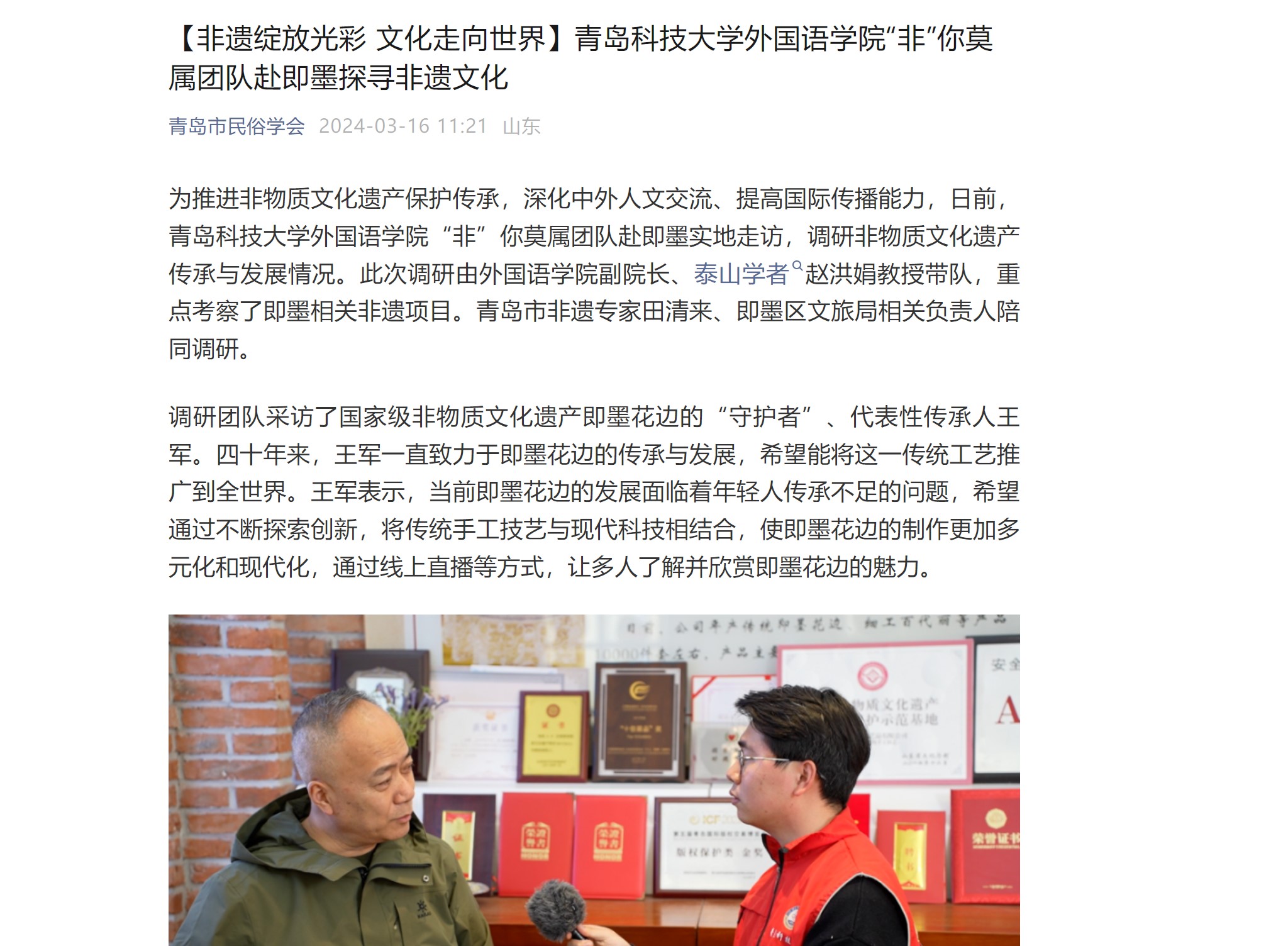 副院长,泰山学者赵洪娟教授指导带领的“非”你莫属团队积极响应时代号召,开启探索中国非物质文化遗产海外传播新征程。他们深入崂山区民俗馆、李沧区文化馆、即墨花边博物馆、即墨古镇等地,与数位非遗传承人展开深入交流,共同探索非遗文化走向世界的新思路新途径,争做“一带一路”非遗海外文化传播破局者。受到中国社会科学网、中国网、中广中文网、今日头条、半岛新闻、青岛市民俗学会、掌上青岛等国内多家媒体报道,引发社会广泛关注。