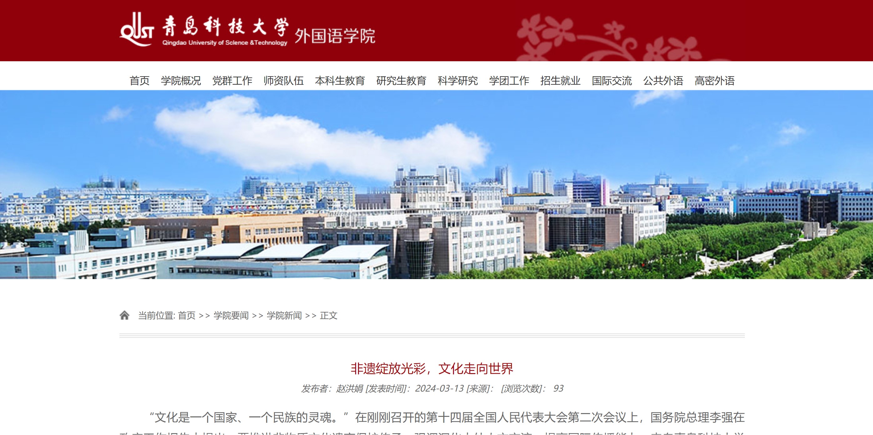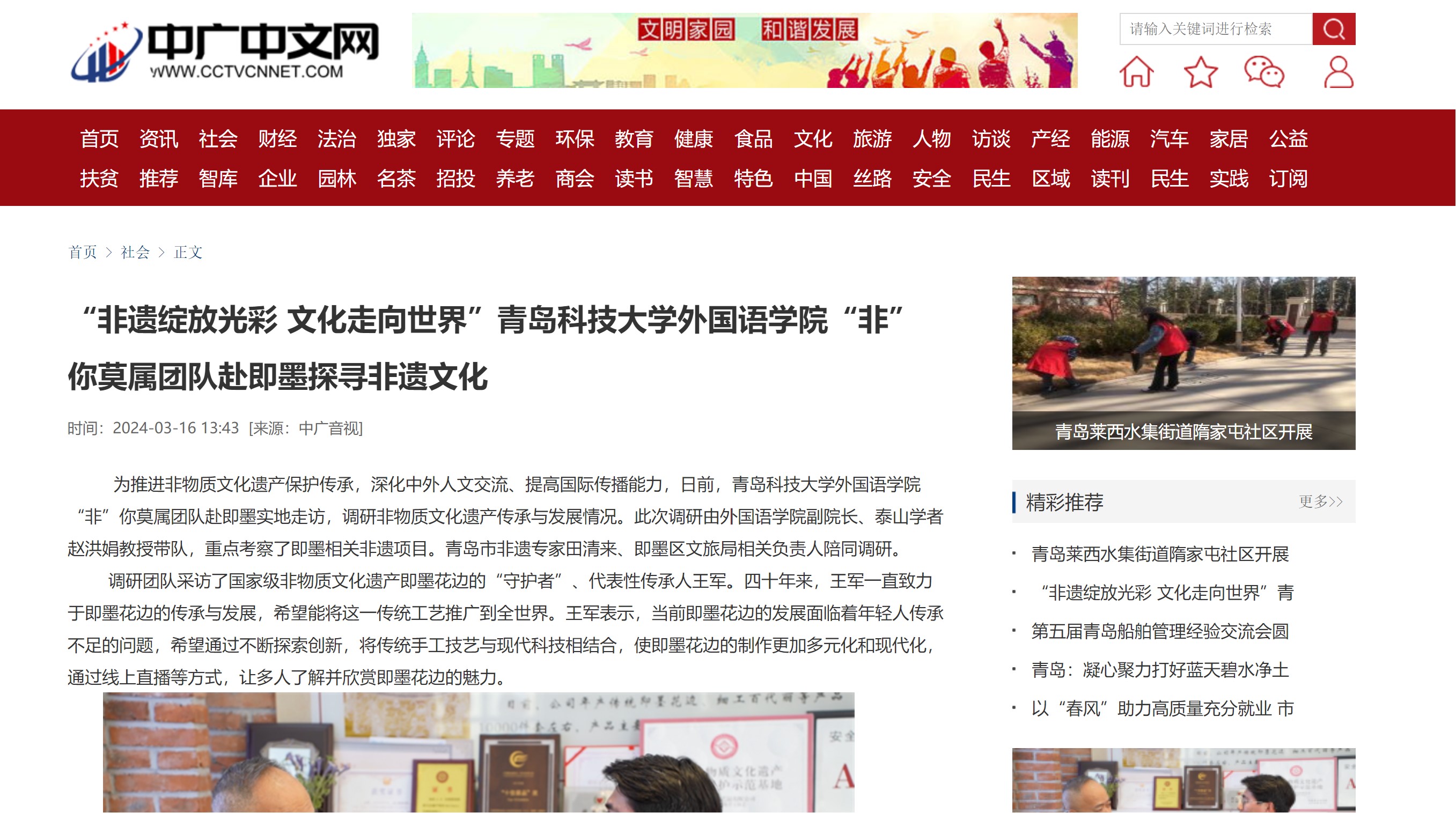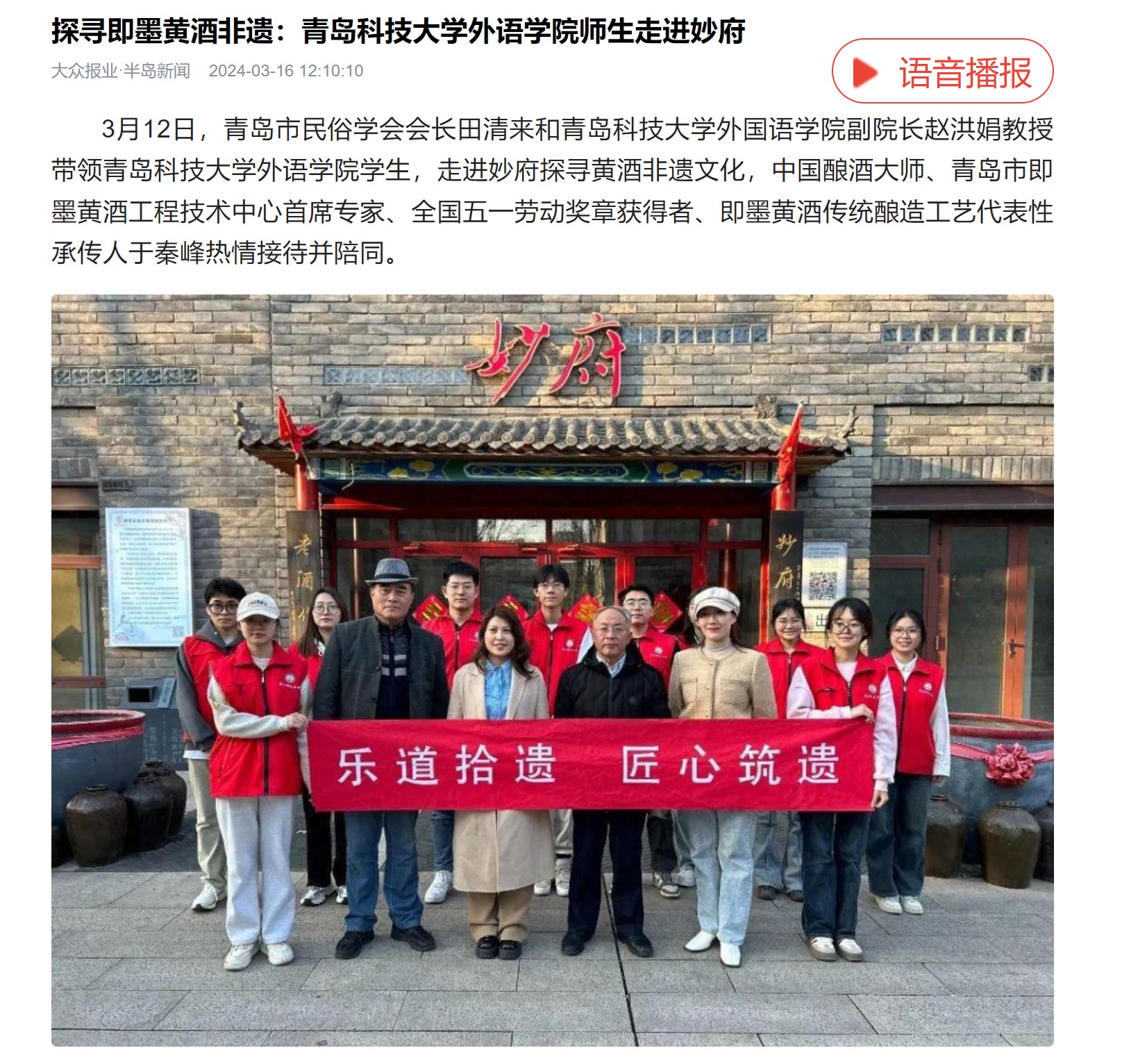 副院长,泰山学者赵洪娟教授指导带领的“非”你莫属团队积极响应时代号召,开启探索中国非物质文化遗产海外传播新征程。他们深入崂山区民俗馆、李沧区文化馆、即墨花边博物馆、即墨古镇等地,与数位非遗传承人展开深入交流,共同探索非遗文化走向世界的新思路新途径,争做“一带一路”非遗海外文化传播破局者。受到中国社会科学网、中国网、中广中文网、今日头条、半岛新闻、青岛市民俗学会、掌上青岛等国内多家媒体报道,引发社会广泛关注。
