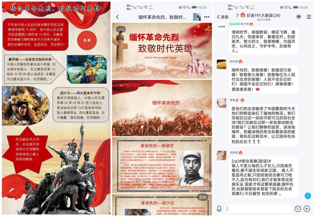 全体师生在这个庄严的时刻低头静立默哀3分钟,对在抗击新冠肺炎疫情斗争牺牲烈士和逝世同胞表示深切哀悼。同时学院号召广大同学登陆“中华英烈网”,参与网上祭扫英烈活动,做文明祭祀的带头人。广大青年学生线上了解的英烈事迹,为在中华民族解放和革命事业中英勇献身的革命先烈,以及在新冠肺炎疫情斗争中的牺牲烈士和逝世同胞献花、祭拜、写留言寄语等,把对先烈的哀悼之情化作浓浓的爱国情怀,用实际行动向为中华民族和中国人民作出贡献的英雄先烈们致敬。