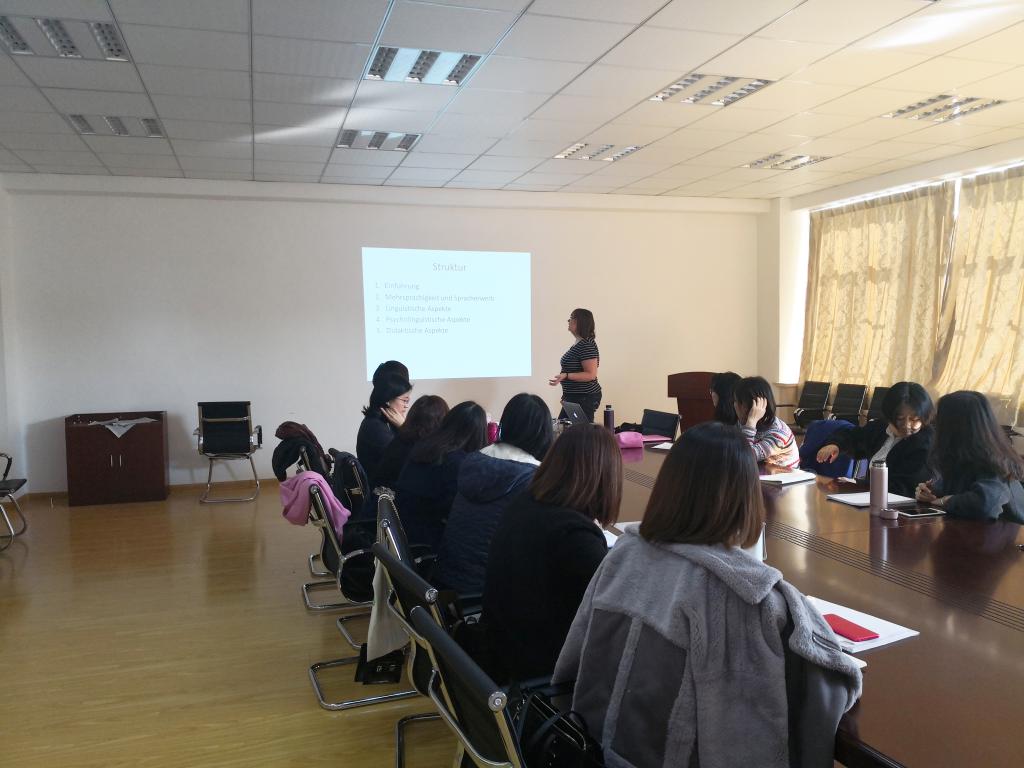 进行了为期一周的访学,期间共举办了三场学术报告,主题分别为《德国的多语化(Mehrsprachigkeit in Deutschland)》、《德语构词法之复合词(Wortbildung-Komposition)》和《二语习得研究心得(L2-Erwerb)》,并围绕《多语化和第三语教学(Mehrsprachigkeits- und Tertiärsprachendidaktik)》这一主题开展了为期三天的教师培训,耽美小说