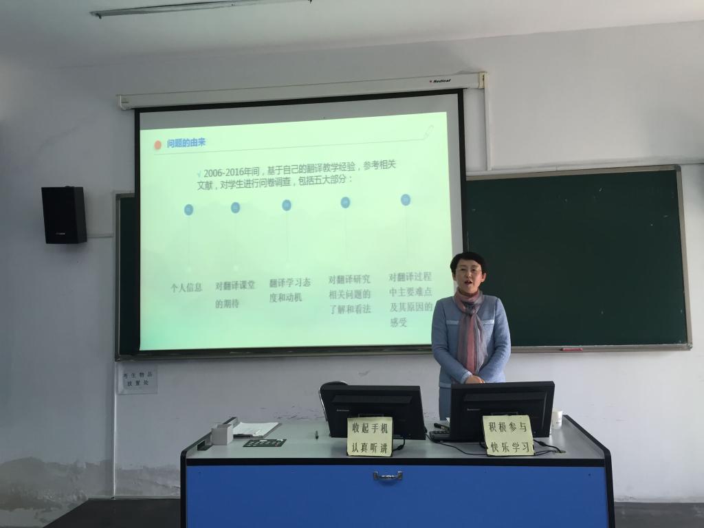 4月27日下午,青岛大学外语学院院长卞建华教授应邀在外语楼418室作了题为《多元文化语境下的翻译与翻译研究---兼谈外语学科项目申报》的报告。报告会由尹洪山院长主持,副院长吕耀中、副院长康宁及部分教师和研究生参加。