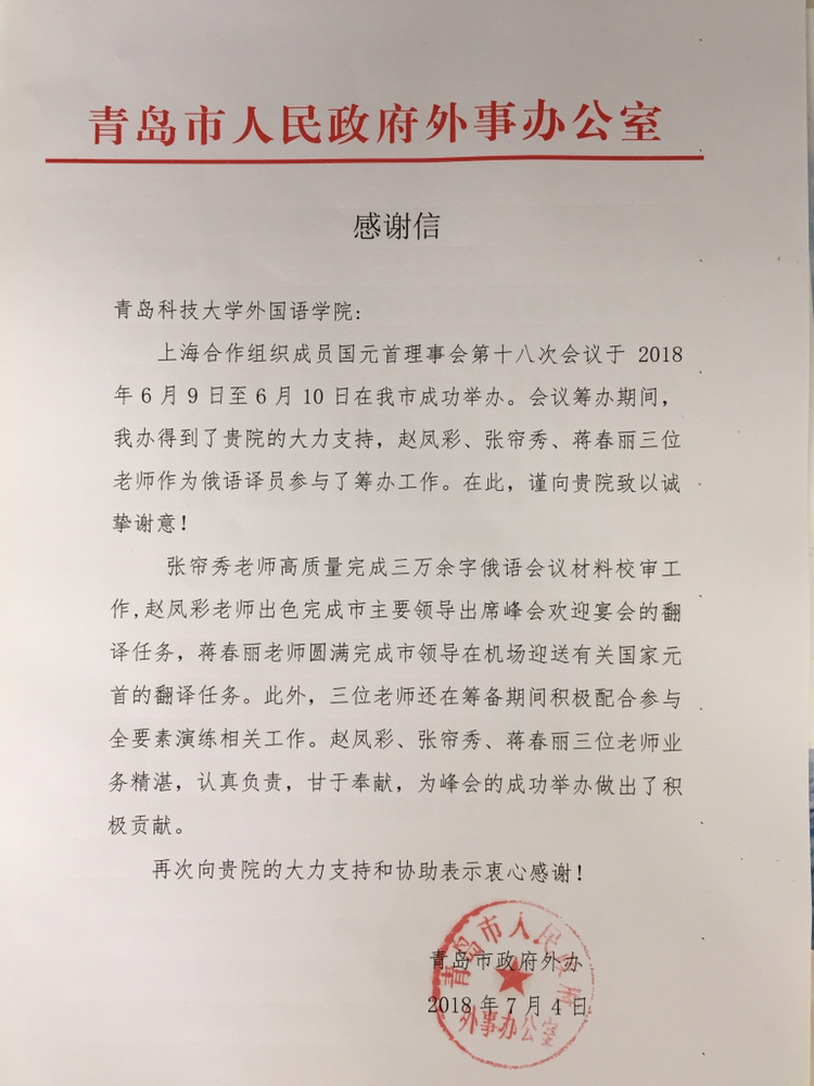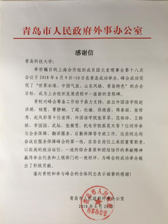 收到青岛市政府外事办公室发来的感谢信,对学校给予上海合作组织成员国元首理事会第十八次会议的鼎力支持表示感谢,对耽美小说