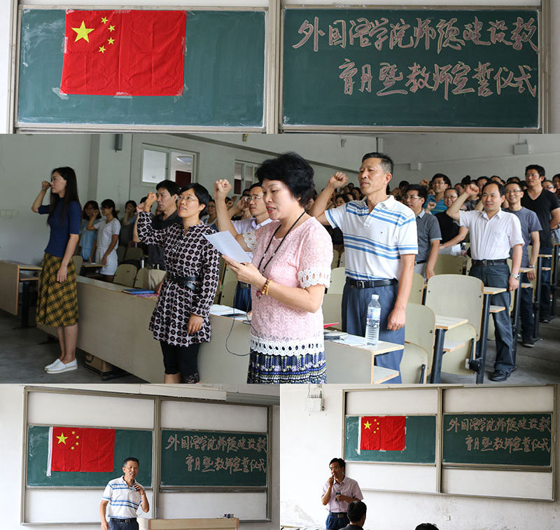 全体老师右手举拳,面对国旗,庄严宣誓,立志忠诚人民教育事业,履行教师神圣职责,敬业爱生、教书育人,严谨治学、服务社会,为人师表、行为世范……