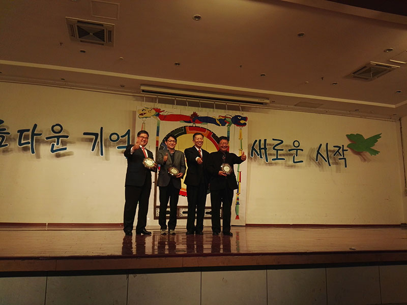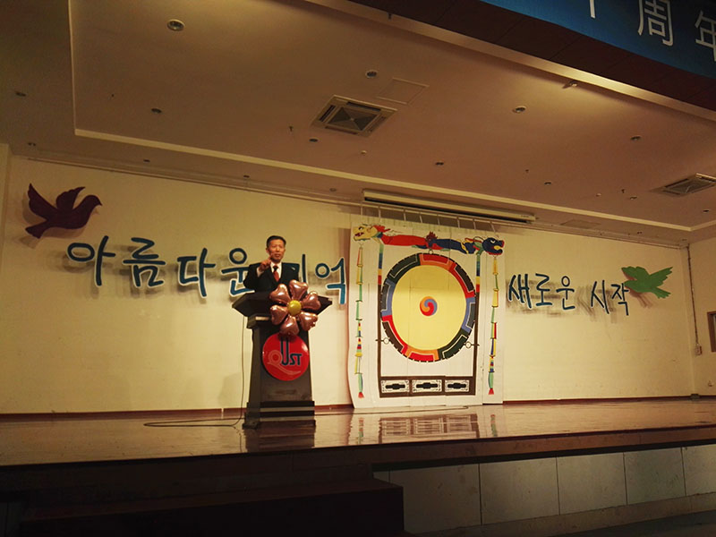 姜德杰院长向为中韩两国文化交流做贡献的韩国社报协会金兴基会长、BRcomm朴钟先代表理事、群山市政府中国代表处尹锡烈代表颁发感谢牌。接着便是毕业生代表刘建勇、13级在校学生代表闫丽依次发言。然后活动进入献花合影阶段,到场学生向辛勤育人、无私奉献的教师们说声:您辛苦了!感动与温情瞬间充斥了全场。之后,精彩的节目表演开始了。徐乐瑶、田文文、刘晓旦等同学表演的舞蹈《给你看》,用震撼的音乐燃烧热情;梁辉同学带来的歌曲《如果没有你》,声音婉转动听;小品《总监嫁到》,笑点颇多;李钟行同学和肖羽宣同学带来的英文歌曲《Buauty And A Beat》和照应主题的韩文歌《Hey Mama》,引来韩国代表们的欢呼;相声表演《满腹经纶》,搞笑幽默,将现场气氛再次炒热;脍炙人口的朝鲜族民歌《阿里郎》,连韩国代表们也手舞足蹈地跟着跳起来;耿嘉微同学与王佳颖同学带来的歌曲表演《思念是一种病》和牟亚鑫、李雪冉等带来的激情舞蹈表演《Boom Clap》,也同样精彩纷呈;最后是由张亚双、孟静等演绎的关于一名现代女生穿越到古代与皇帝相爱的韩语话剧《扑通扑通Love》,使全场陷入了韩剧的浪漫气氛中。活动在南老师跟崔老师领唱、全体同学合唱的韩文歌曲《사랑해》中完美落下帷幕!
