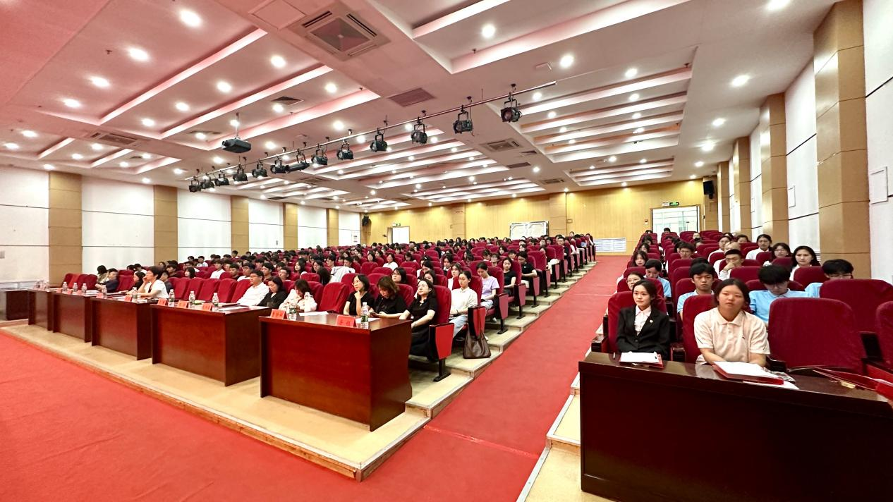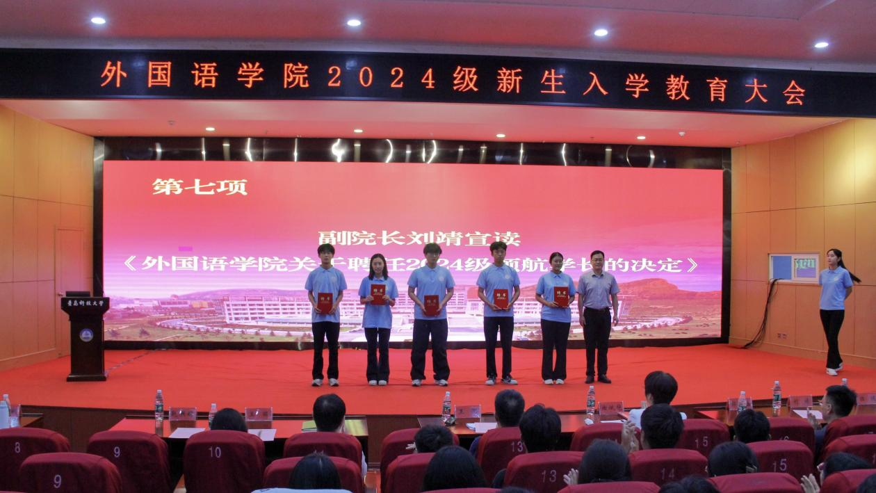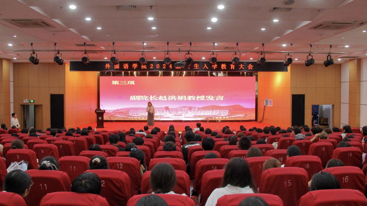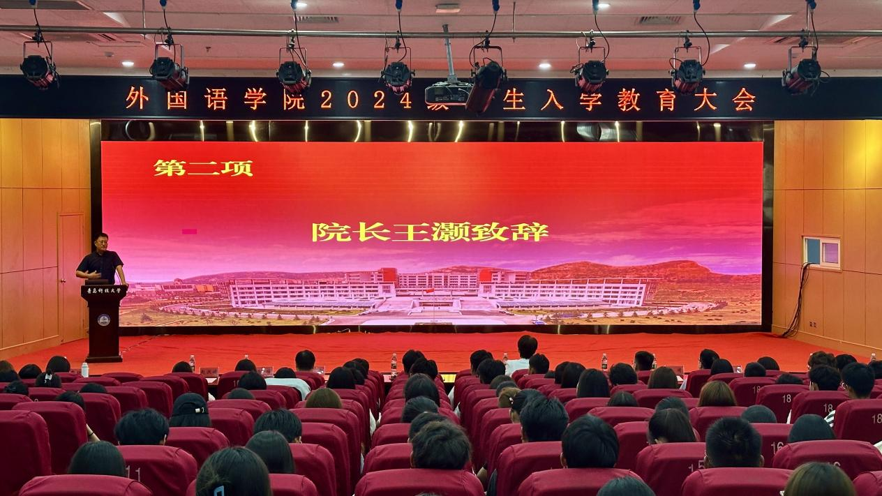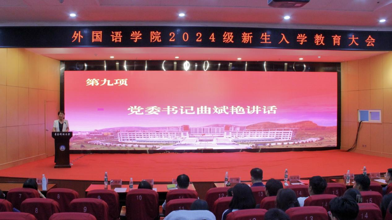 2024级新生入学教育大会在英科报告厅召开。学院党委书记曲斌艳、院长王灏、党委副书记兼副院长马寒、副院长刘靖、副院长赵洪娟、系主任、辅导员、2024级全体新生参加会议。