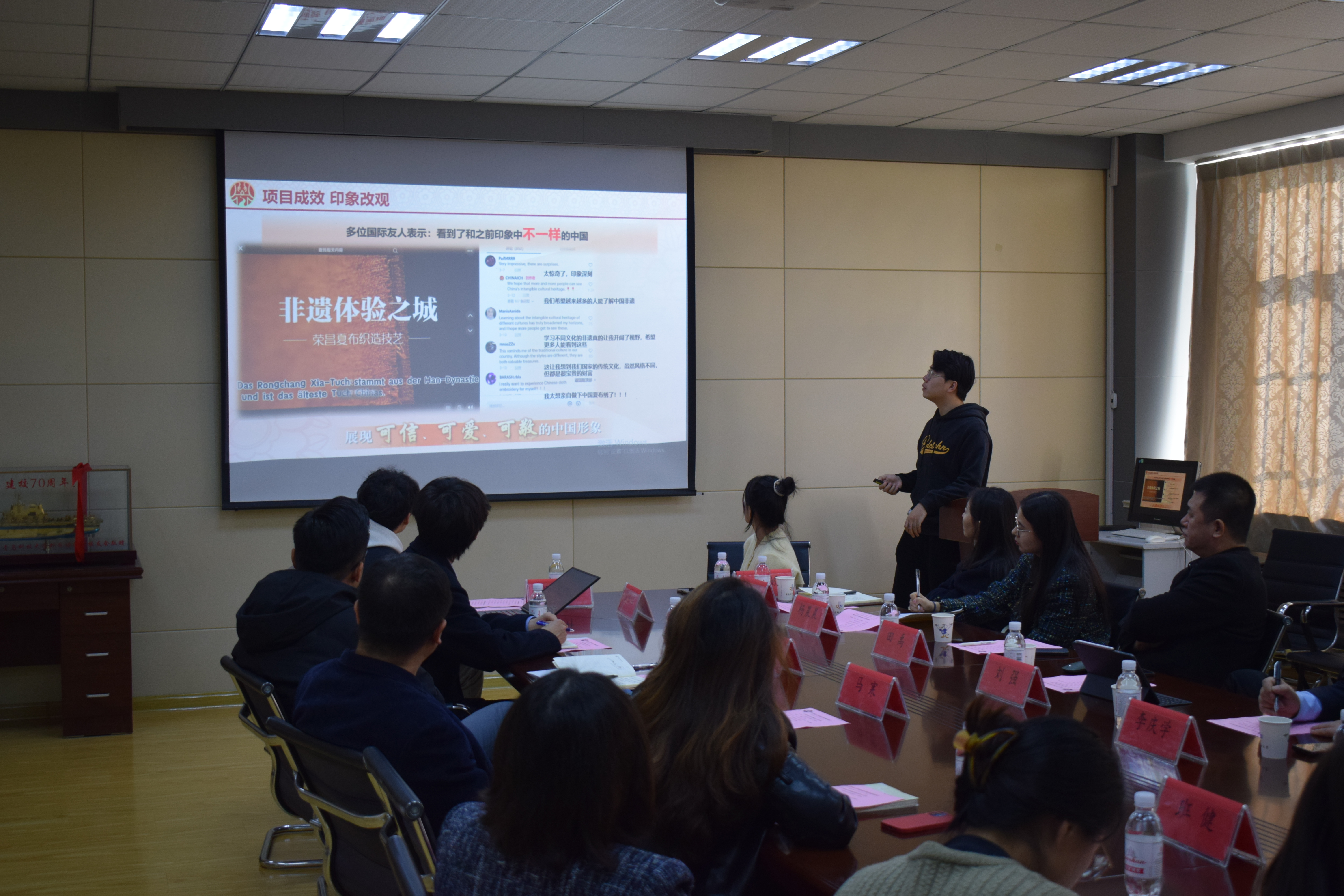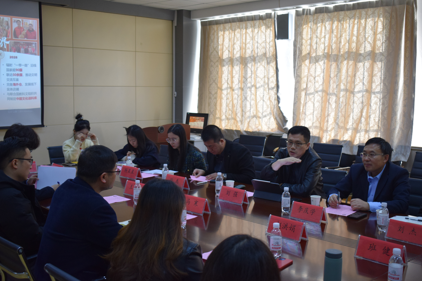 一行的来访表示欢迎,介绍了学院在人才培养、专业设置、学科竞赛、志愿服务活动等情况。赵洪娟和其指导的“非你莫属——一带一路非遗破局者”项目团队就如何打造优秀团队、新文科项目在“挑战杯”赛事中如何凸显优势等问题展开交流分享。