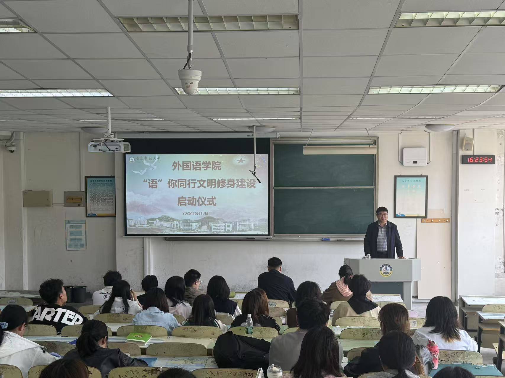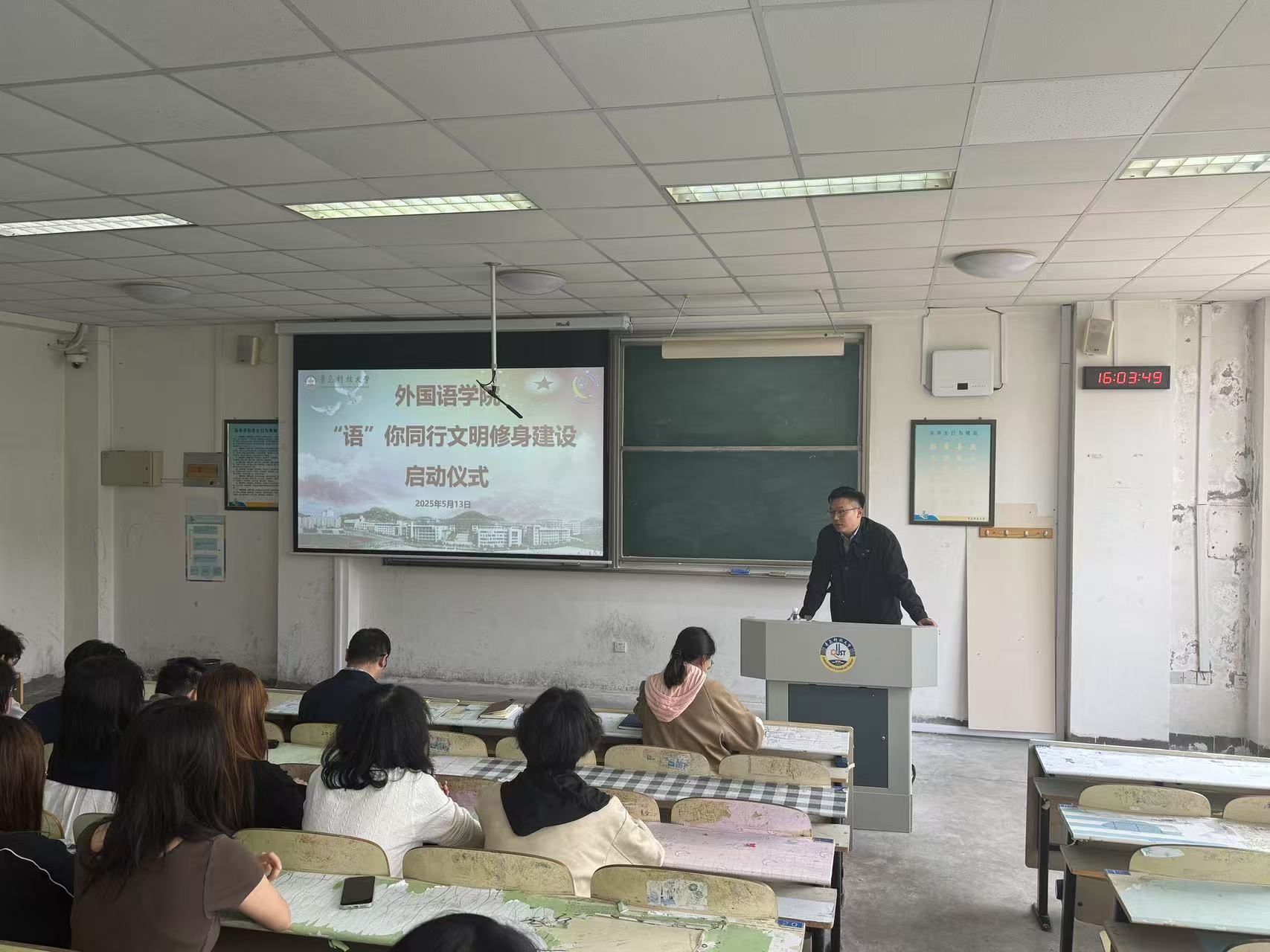 于5月13日启动“语”你同行文明修身建设,学院党委副书记兼副院长马寒、团委副书记兼学工办副主任王玉凯、辅导员马昆及学生代表参加活动。