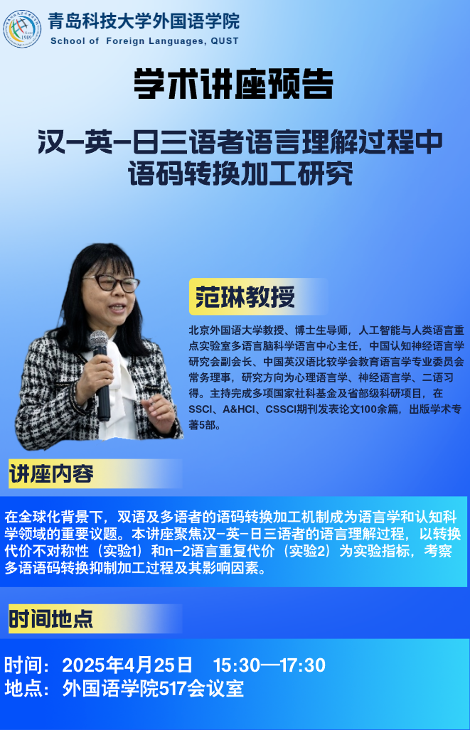 讲座内容简介:在全球化背景下,双语及多语者的语码转换加工机制成为语言学和认知科学领域的重要议题。本讲座聚焦汉-英-日三语者的语言理解过程,以转换代价不对称性(实验1)和n-2语言重复代价(实验2)为实验指标,考察多语语码转换抑制加工过程及其影响因素。