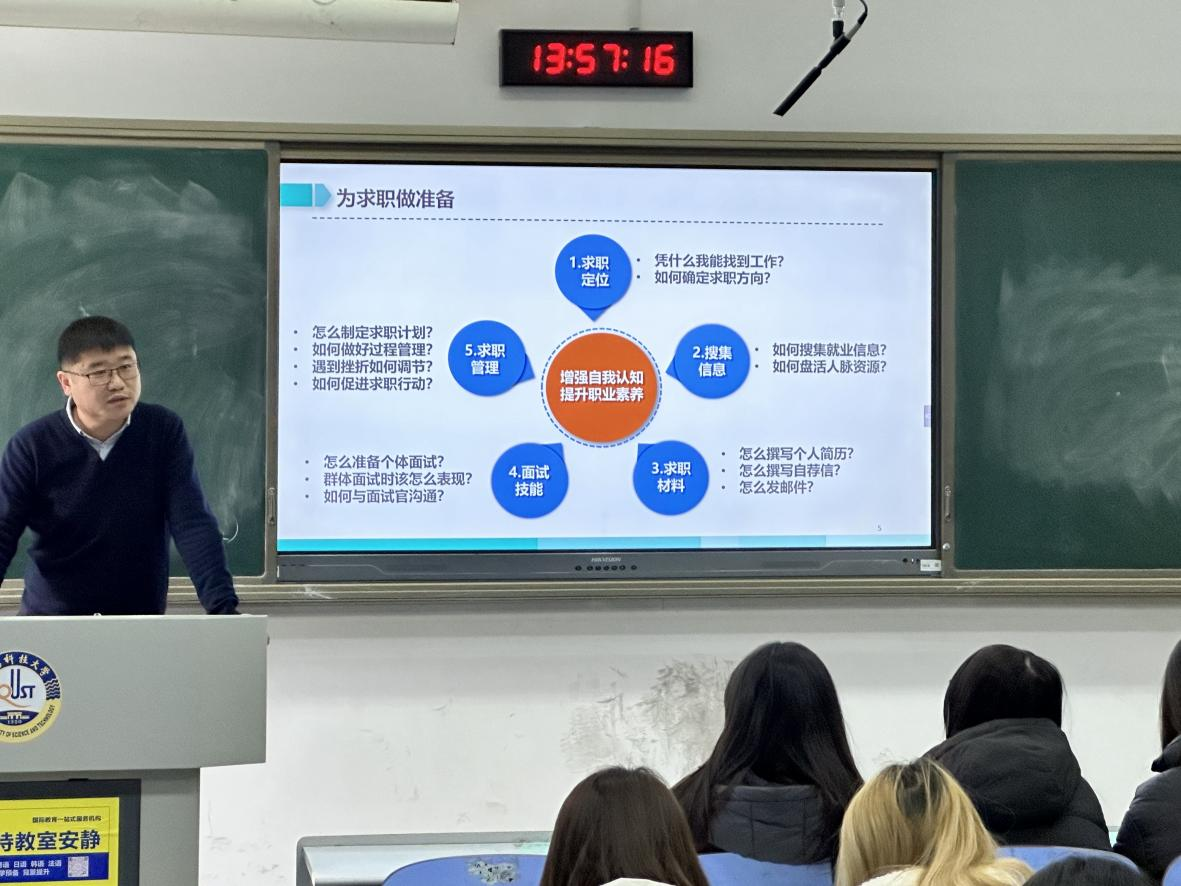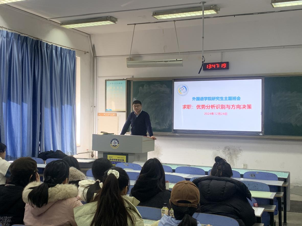 于12月24日在弘毅楼B106举办“求职:优势分析与方向决策”就业指导主题班会。主题班会由研究生辅导员、学院党委副书记兼副院长马寒主讲,全体2023级研究生参加。