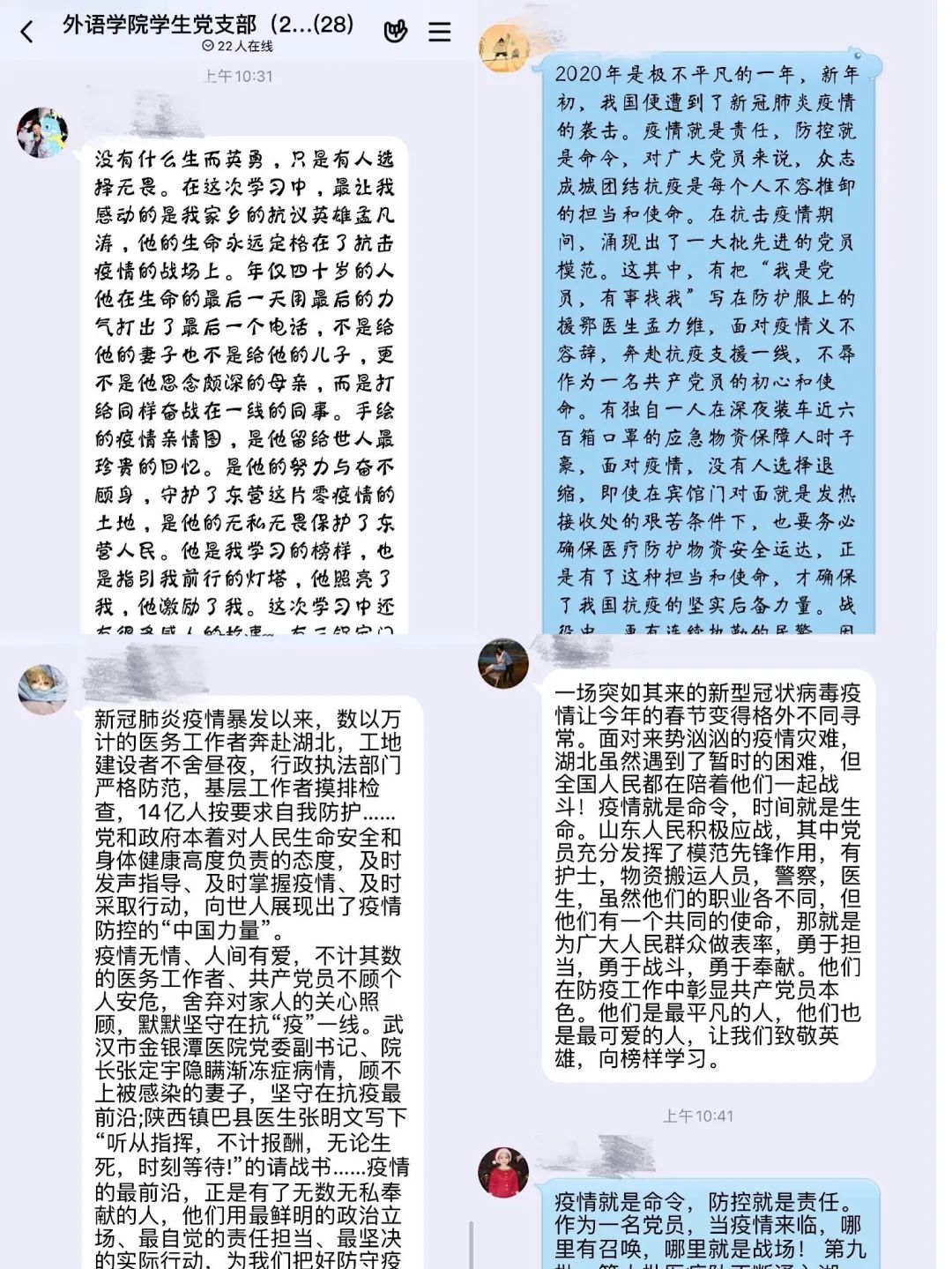 党支部开展了主题党日活动,教育引导同学们学习新冠肺炎疫情期间的抗疫榜样的优秀事迹,感受榜样力量,从而更加深刻地体会中国共产党全心全意为人民服务的宗旨。