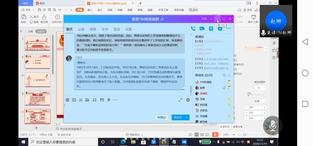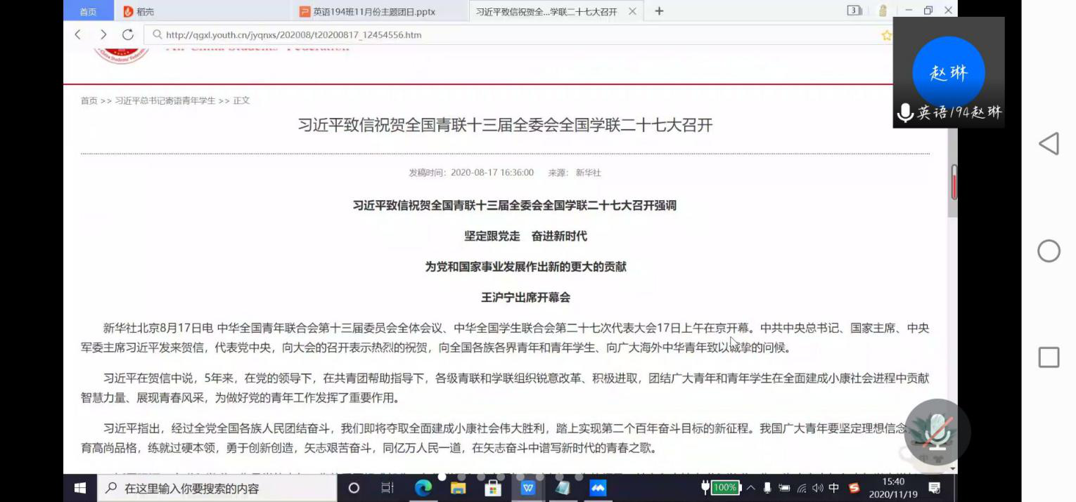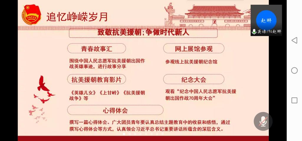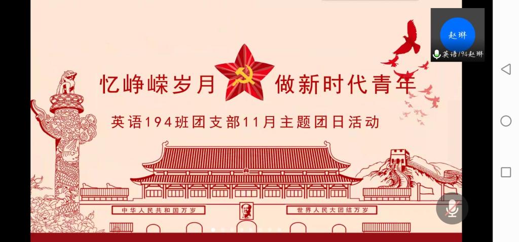 英语194团支部依托线上平台举行了“忆峥嵘岁月,做新时代青年”主题团日活动。团支部全体团员参与,团日活动由团支部书记主持。