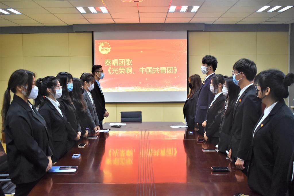 在庄严的国歌声中,2022年新团员入团仪式正式开始。王雨昕老师主持此次仪式并宣布新团员名单。张湘钧老师为韩语191班张明钰、日语202班李悦菡、俄语211李彤、韩语211唐佳璇、日语211周子怡五位新团员佩戴团徽。随后,新团员集体宣誓,从佩戴上团徽的这一刻起,新团员们铭记自己肩负的责任,努力履行团员的义务,用实际行动来表明自己无悔”共青团员“这个光荣的称号。张湘钧老师领学《中国共产主义青年团章程》团员义务和权利,新团员表示会积极履行团员义务,在活动中起模范作用。接下来,韩语191班张名钰同学代表新团员发言,她代表全体新团员作出承诺:发扬共青团的优良传统,以团员的标准严格要求自己,用热情谱写辉煌。韩语211时心仪同学作为老团员代表发言,她向团员们发出三点倡议,呼吁团员们珍惜青春年华,崇尚科学,追求真知,为团徽增辉,为团旗增色,为实现共产主义事业而奋斗。伴随着全场齐唱共青团团歌,本次主题团课暨入团仪式顺利落下帷幕。