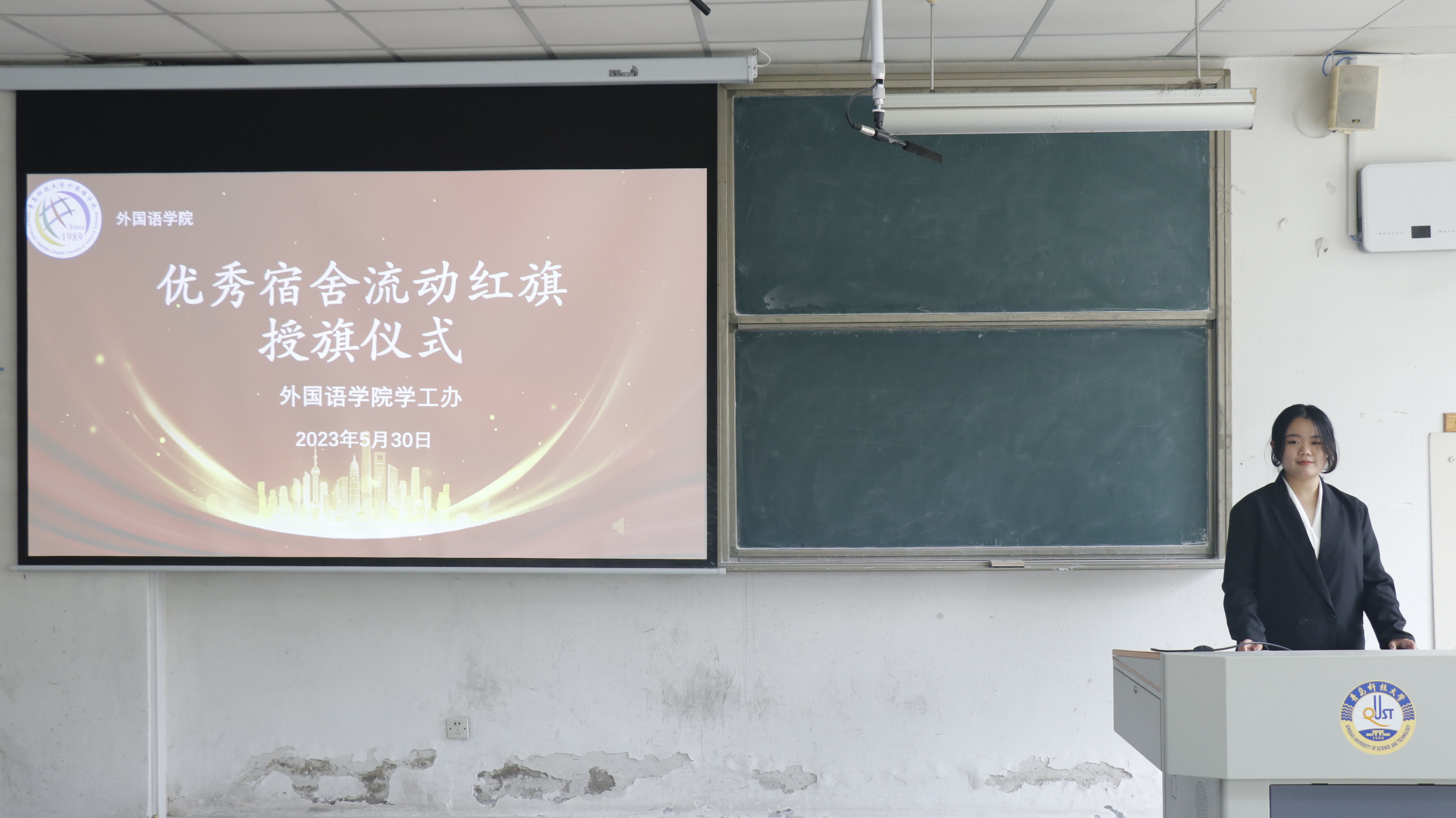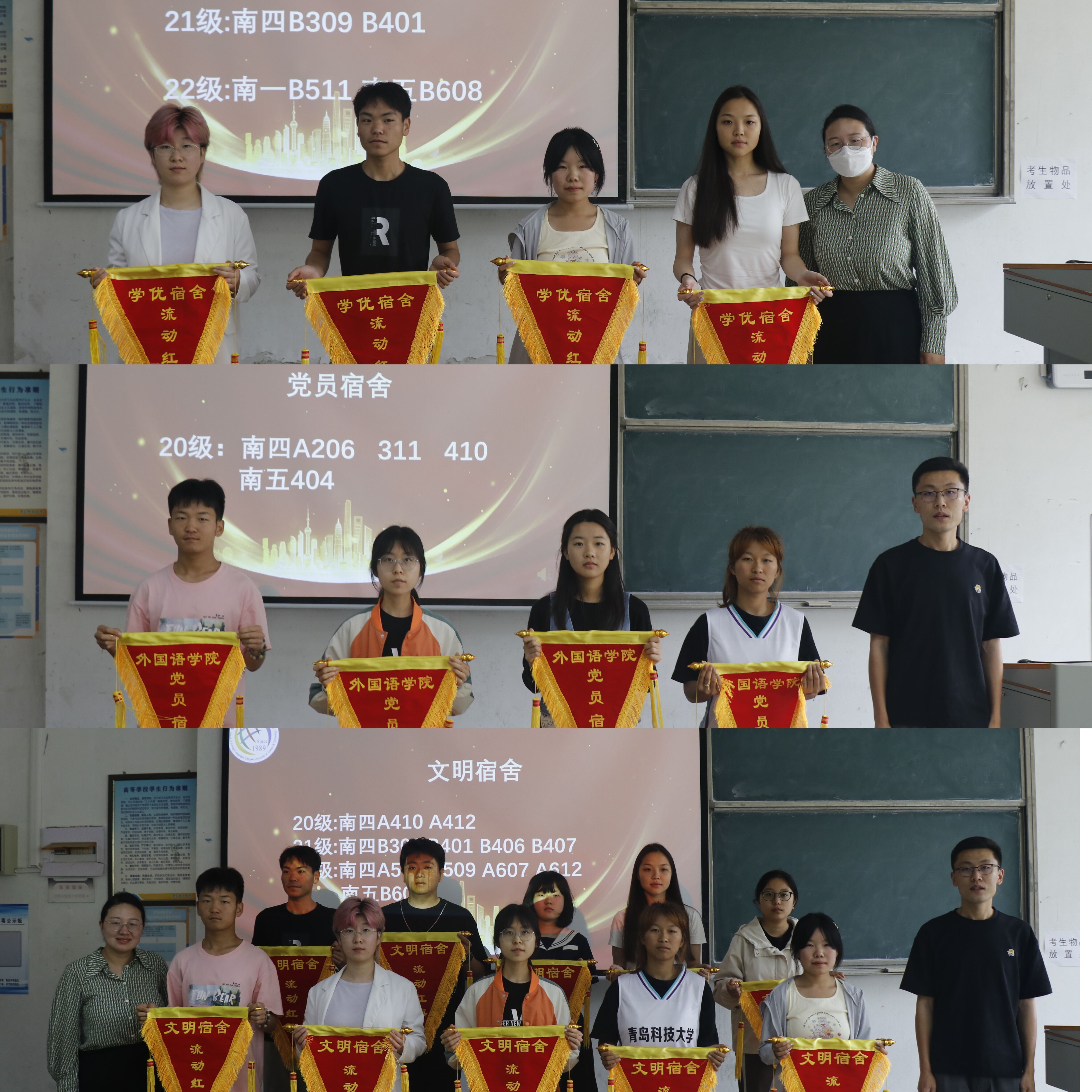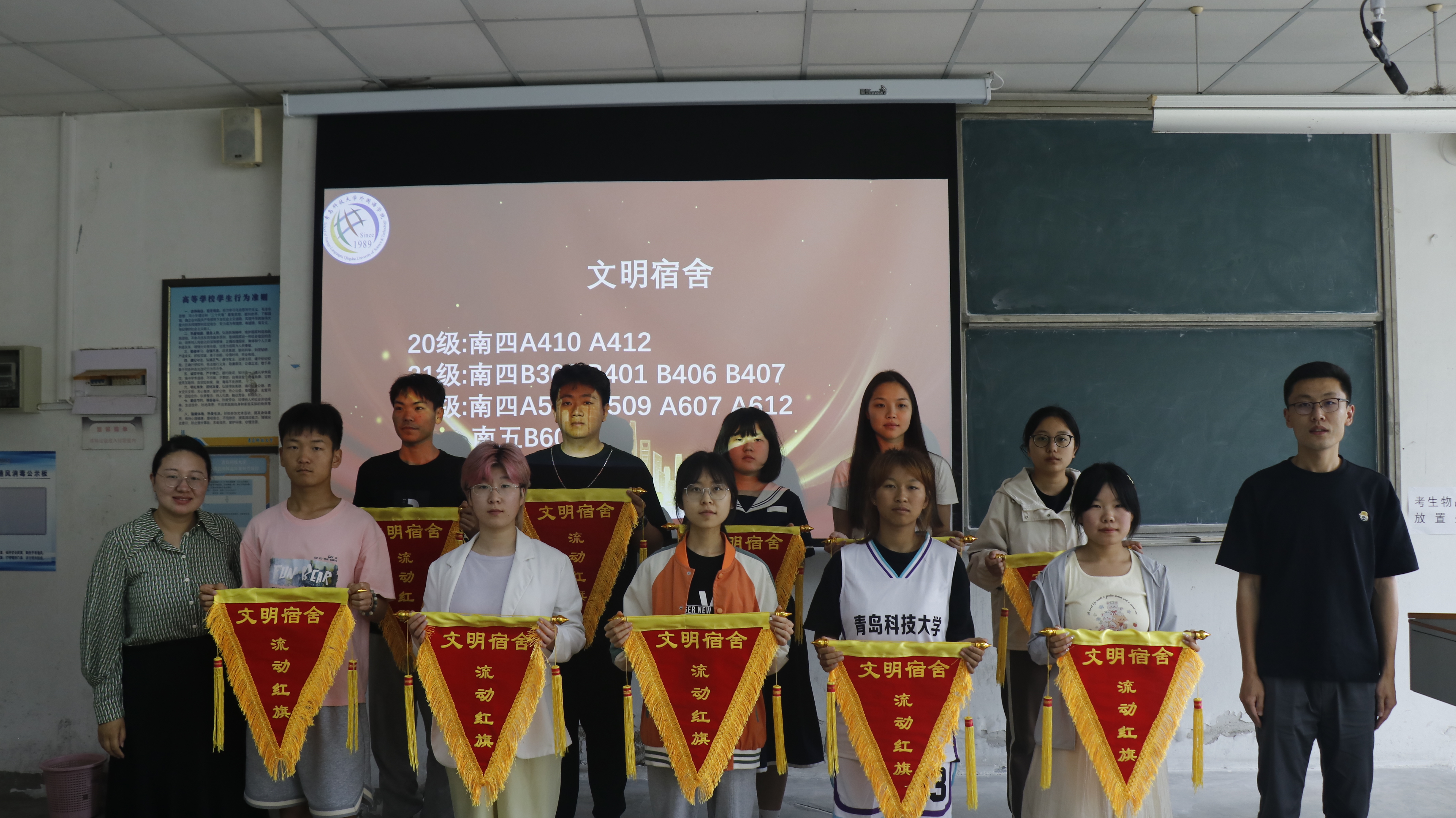 学工办于弘毅B101教室举行优秀宿舍流动红旗授旗仪式,出席本次活动的有学工办主任刘妍君老师、辅导员张湘钧老师以及各优秀宿舍代表。